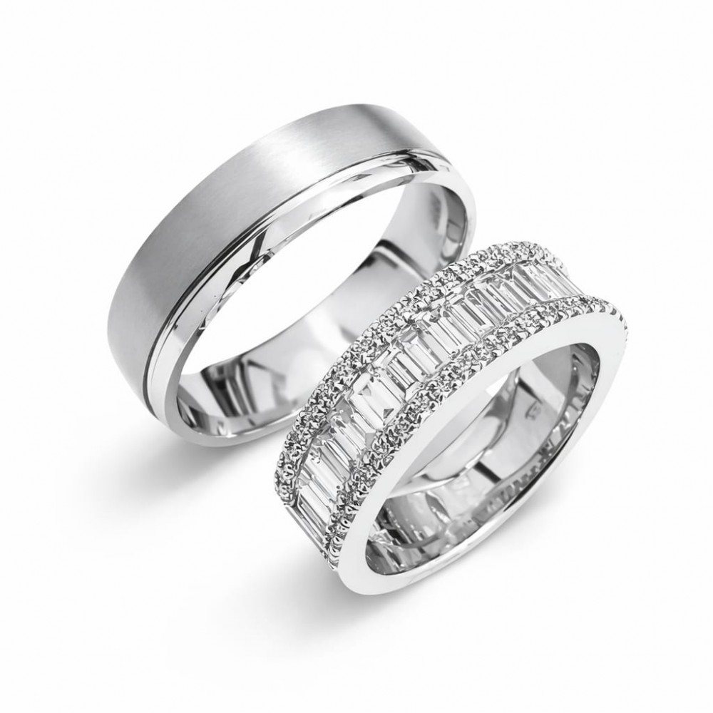 Verighete din aur alb din 14k cu diamante Baget de 0.98 ct si diamante rotunde de 0.24 ct ct. Greutatea aproximativa este de 11.31 gr/set. Verighetele se pot face pe comanda si din aur de 18k. Putem modifica design-ul in functie de bugetul dumneavastra. Putem alege...