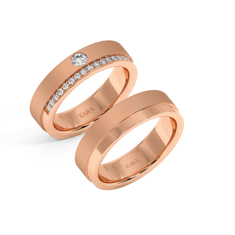 Verighete din aur din 14k cu diamante de 0.26ct. Latime verigheta barbat 6mm, latime verigheta dama 5mm. Greutatea aproximativa este de 14 gr/set.