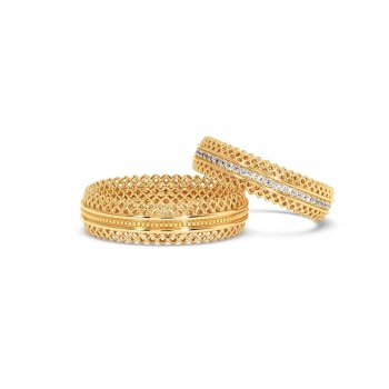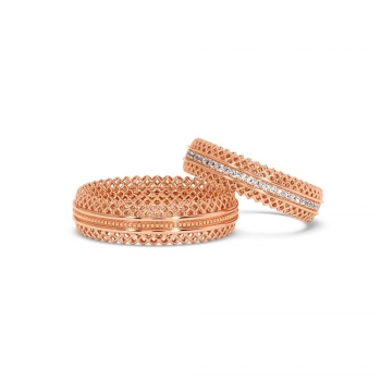 Verighete din aur de 14K cu diamante albe de 0.27ct. Greutatea aproximativa este de 9.00gr/set. Latime verigheta dama 5.20mm, latime verigheta barbat 6.10mm.
