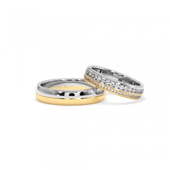 Verighete din aur de 14K cu diamante albe de 0.56ct. Greutatea aproximativa este de 11.00gr/set. Latime verigheta dama 4.50mm, latime verigheta barbat 5mm.