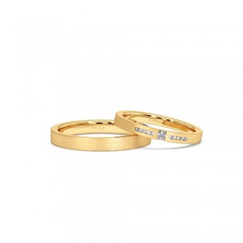 Verighete din aur de 14K cu un diamant princess cut de 0.04ct si diamante rotunde de 0.03ct. Greutatea aproximativa este de 7.50gr/set. Latime verigheta dama 2.40mm, latime verigheta barbat 3.10mm.