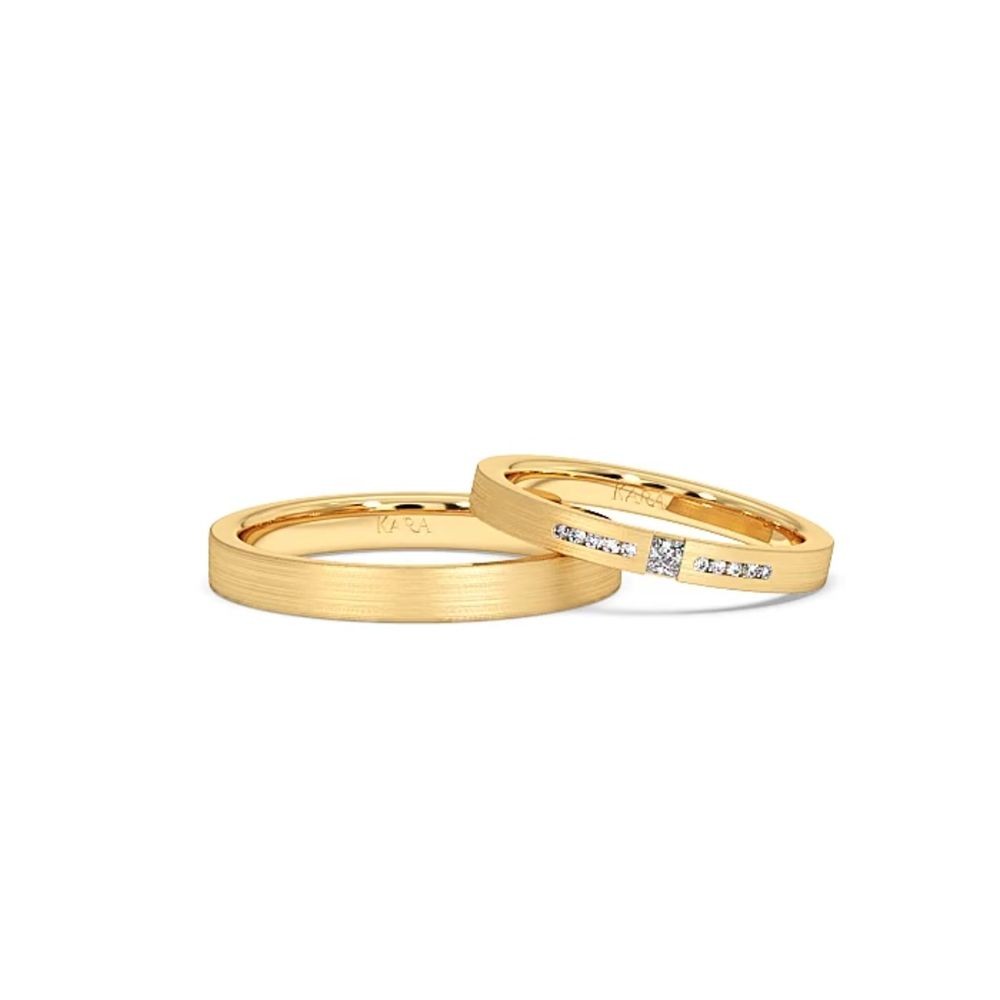 Verighete din aur de 14K cu un diamant princess cut de 0.04ct si diamante rotunde de 0.03ct. Greutatea aproximativa este de 7.50gr/set. Latime verigheta dama 2.40mm, latime verigheta barbat 3.10mm.