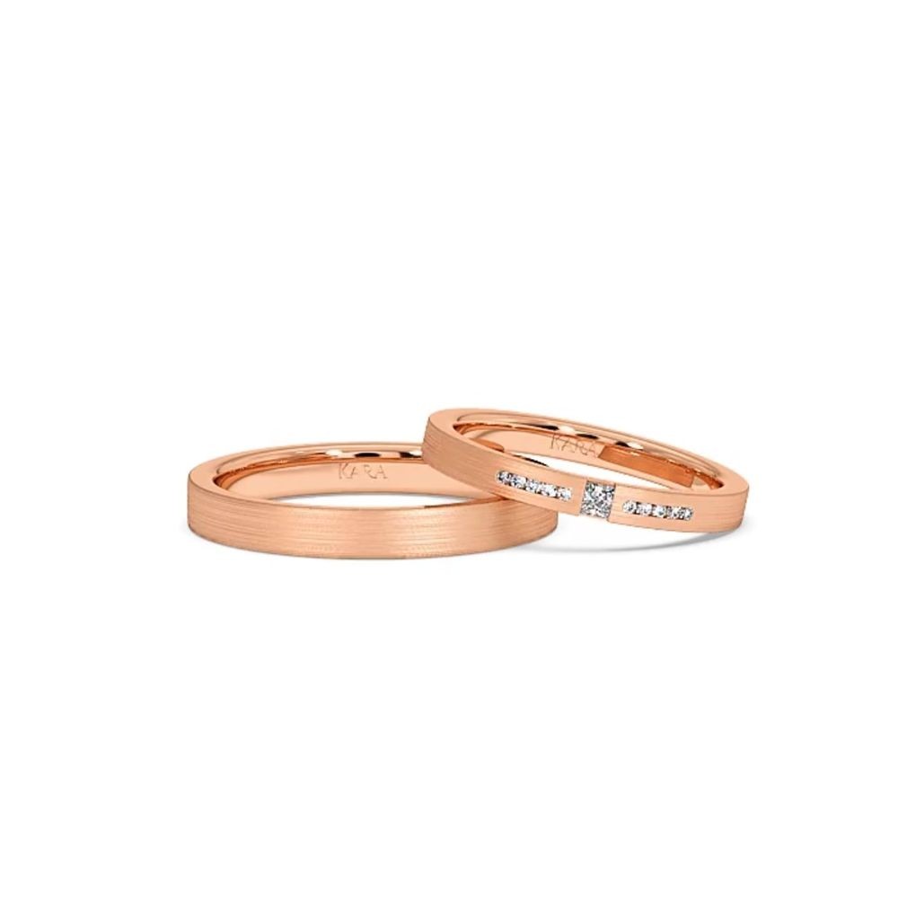 Verighete din aur de 14K cu un diamant princess cut de 0.04ct si diamante rotunde de 0.03ct. Greutatea aproximativa este de 7.50gr/set. Latime verigheta dama 2.40mm, latime verigheta barbat 3.10mm. Verighetele se pot face pe comanda si din aur de 18k. Putem modifica design-ul in functie...